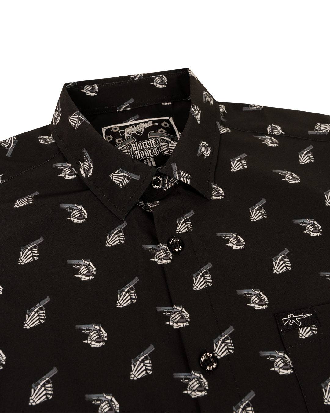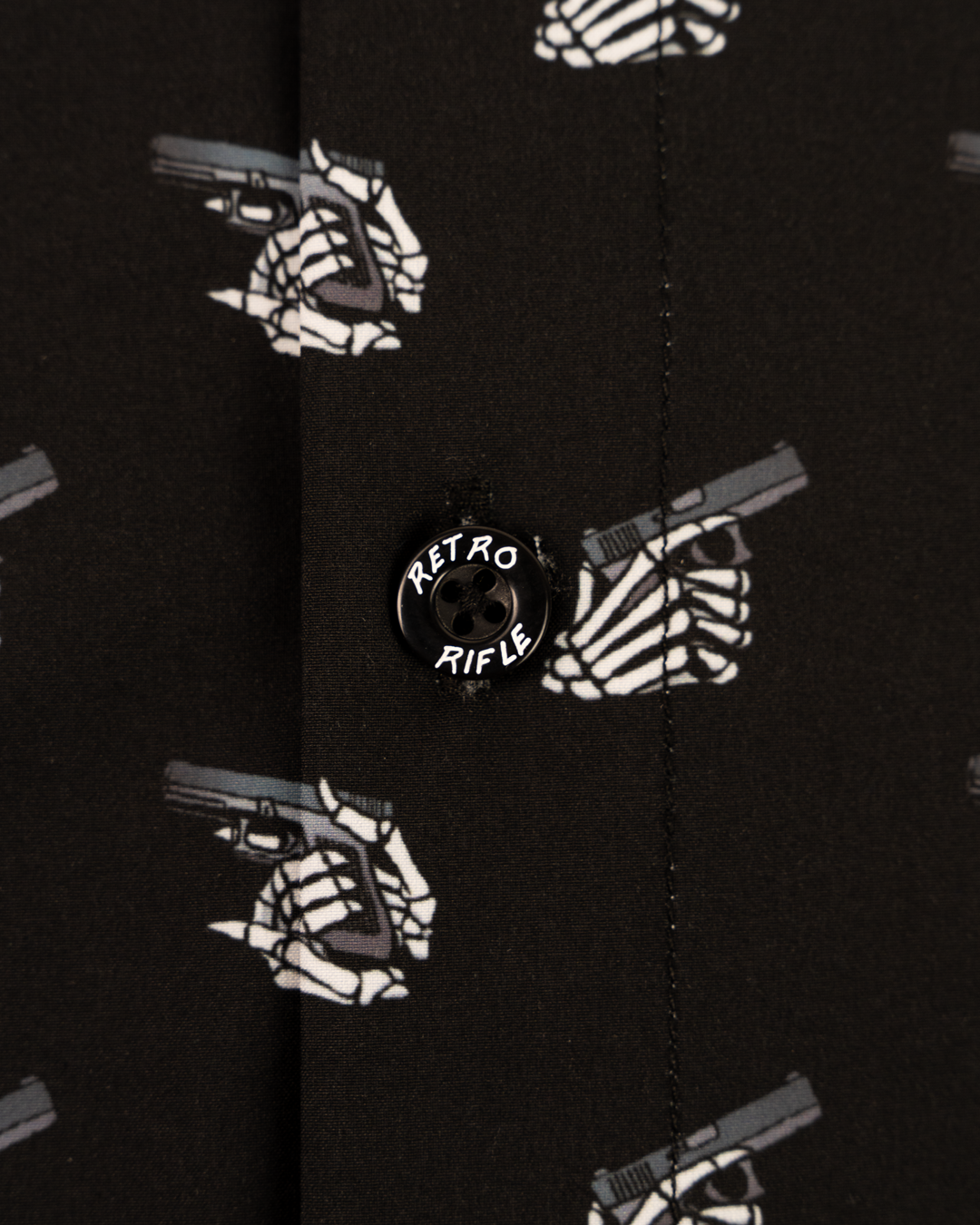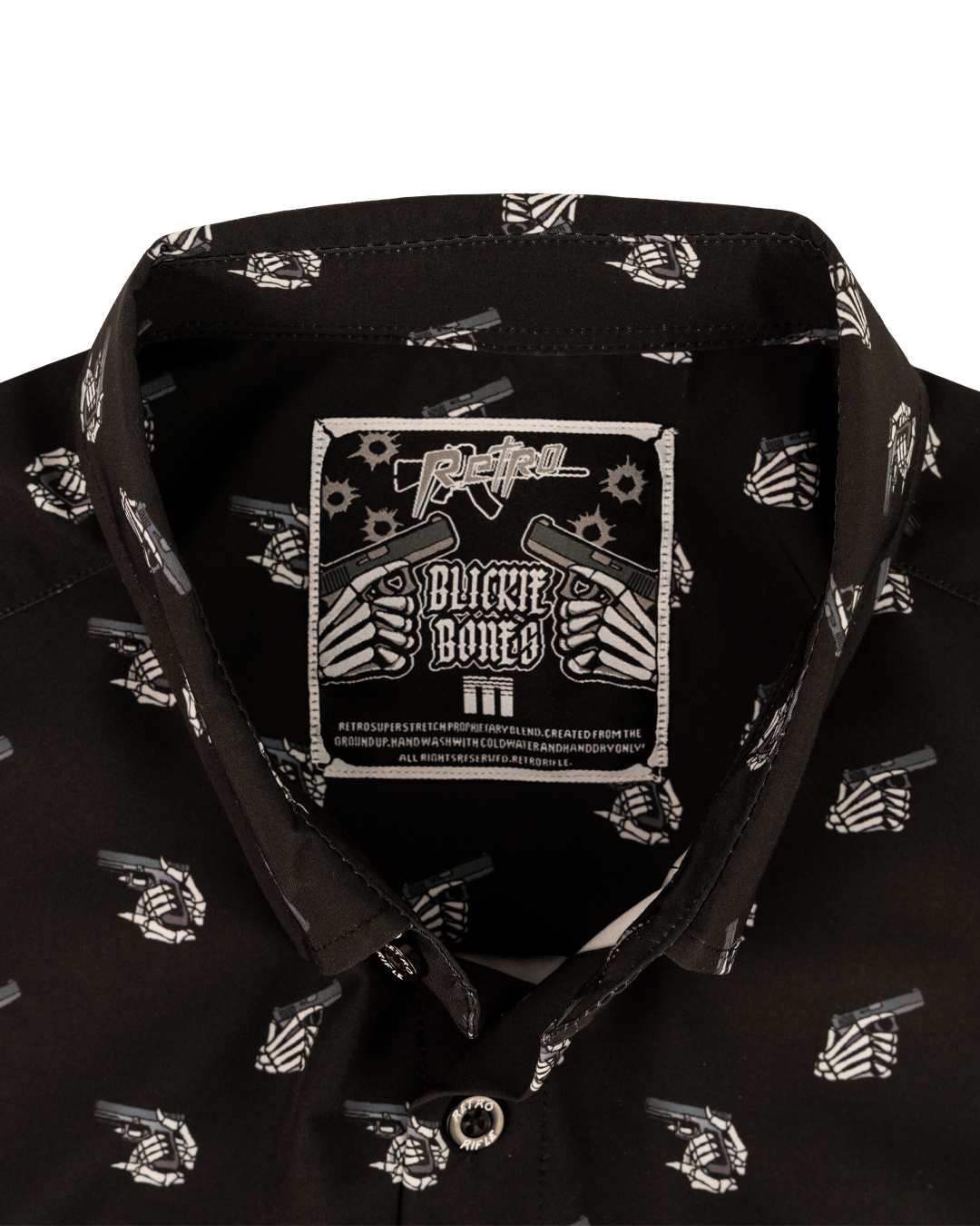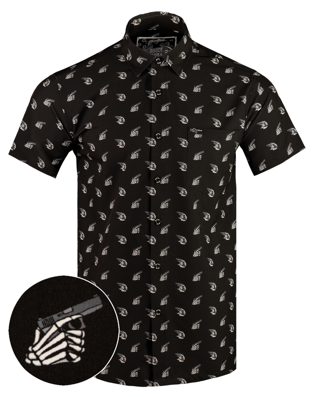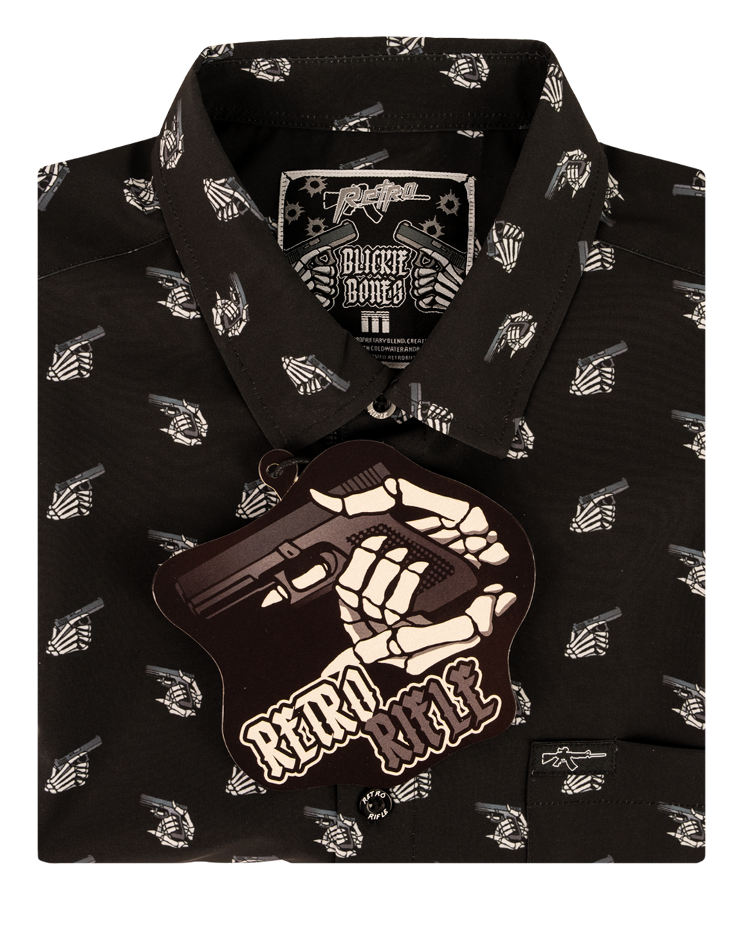 Lock and load with the Blickie Bones button down. Even skeletons stay strapped. Light, breathable button down. 4000+ positive reviews.