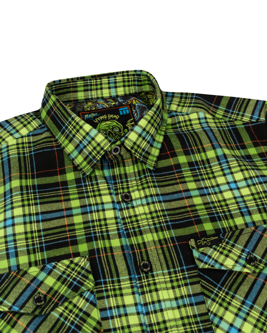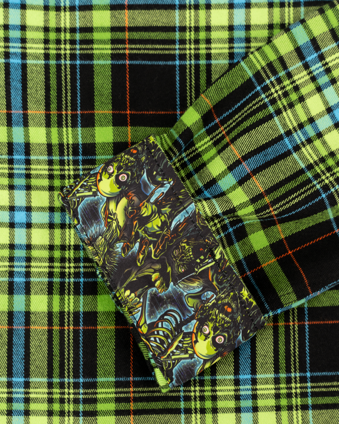 98% polyester 2% spandex, true to size, custom designed cuff and yoke.