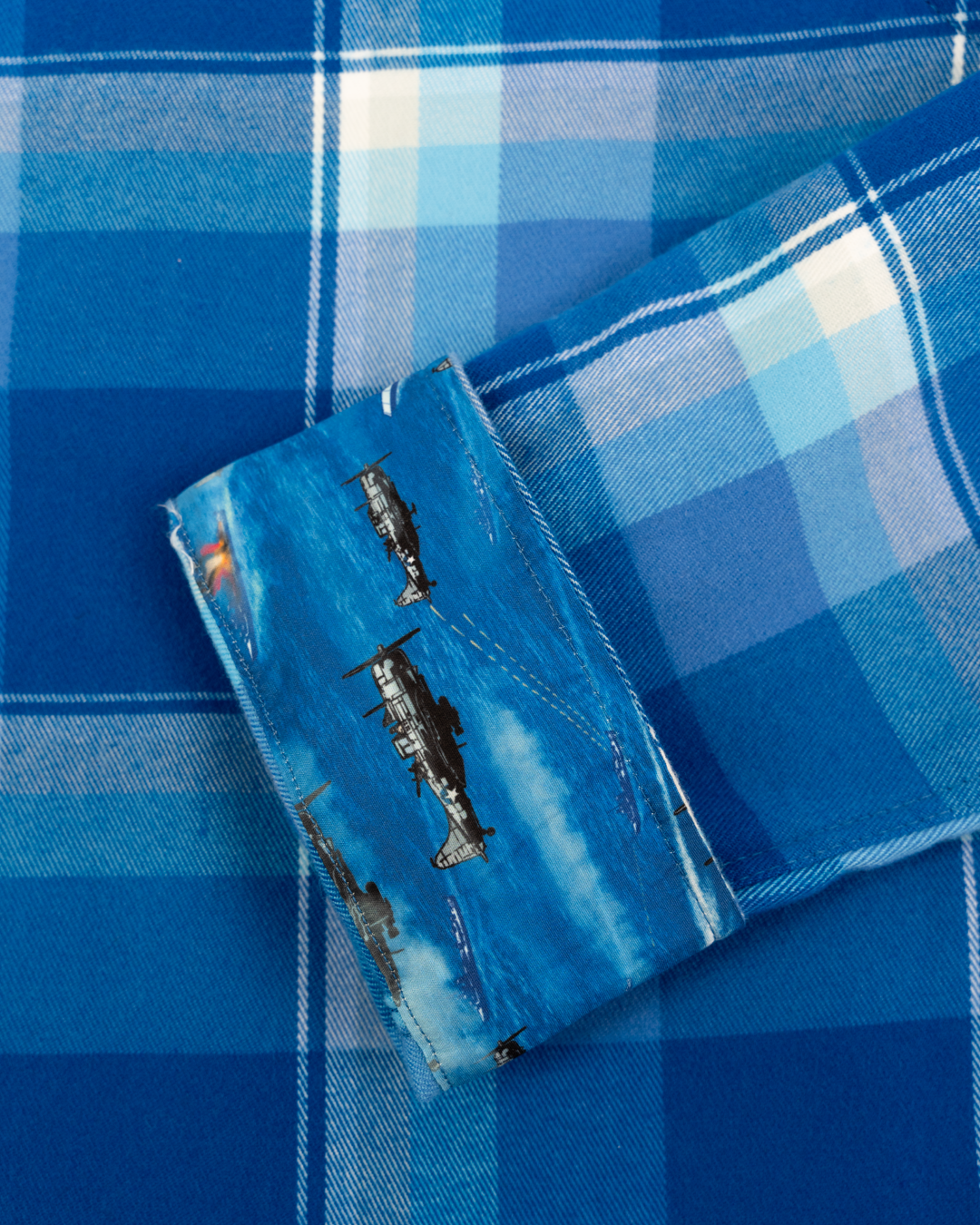 98% polyester 2% spandex, true to size, custom designed cuff and yoke.