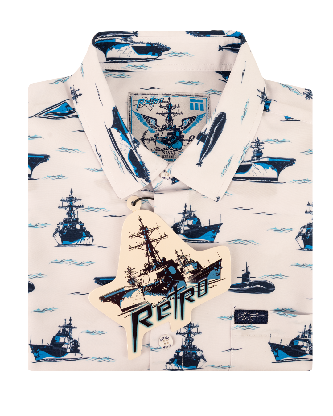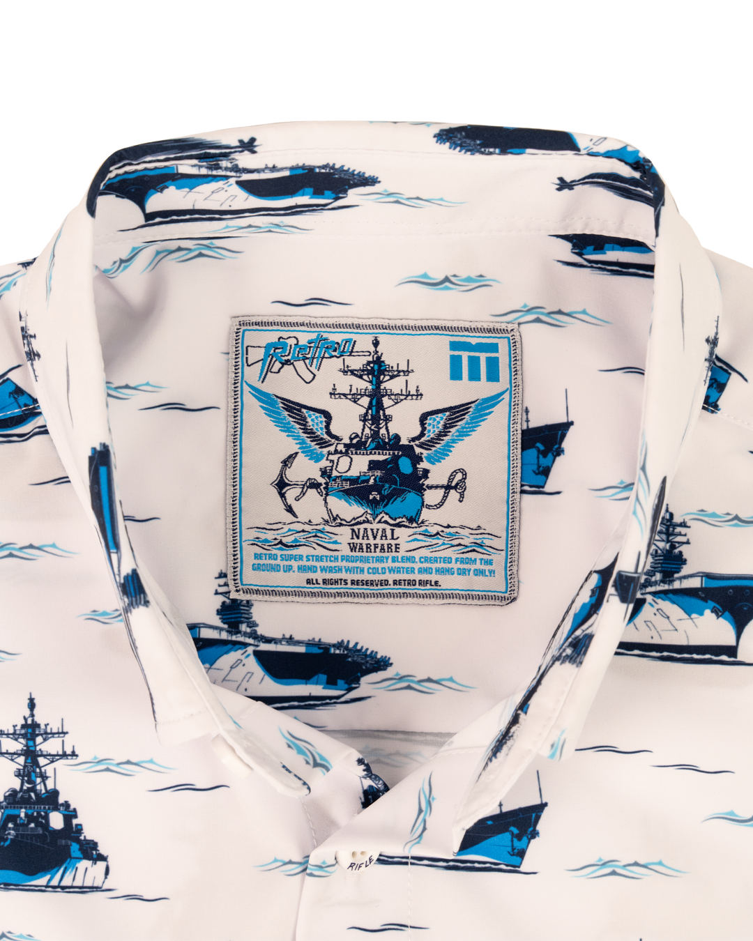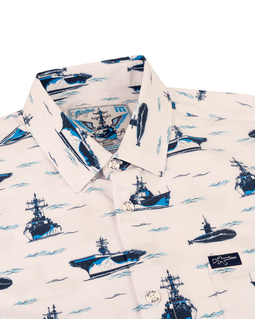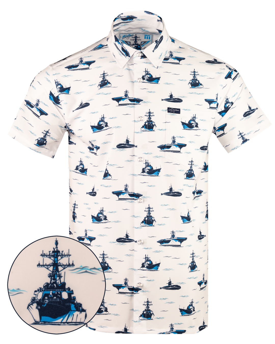 Don't sink your battleship! Rule the seas with the Naval Warfare button down. If battleships, aircraft carriers and submarines are your vibe, this one's for you! Light, breathable button down. 4000+ positive reviews.