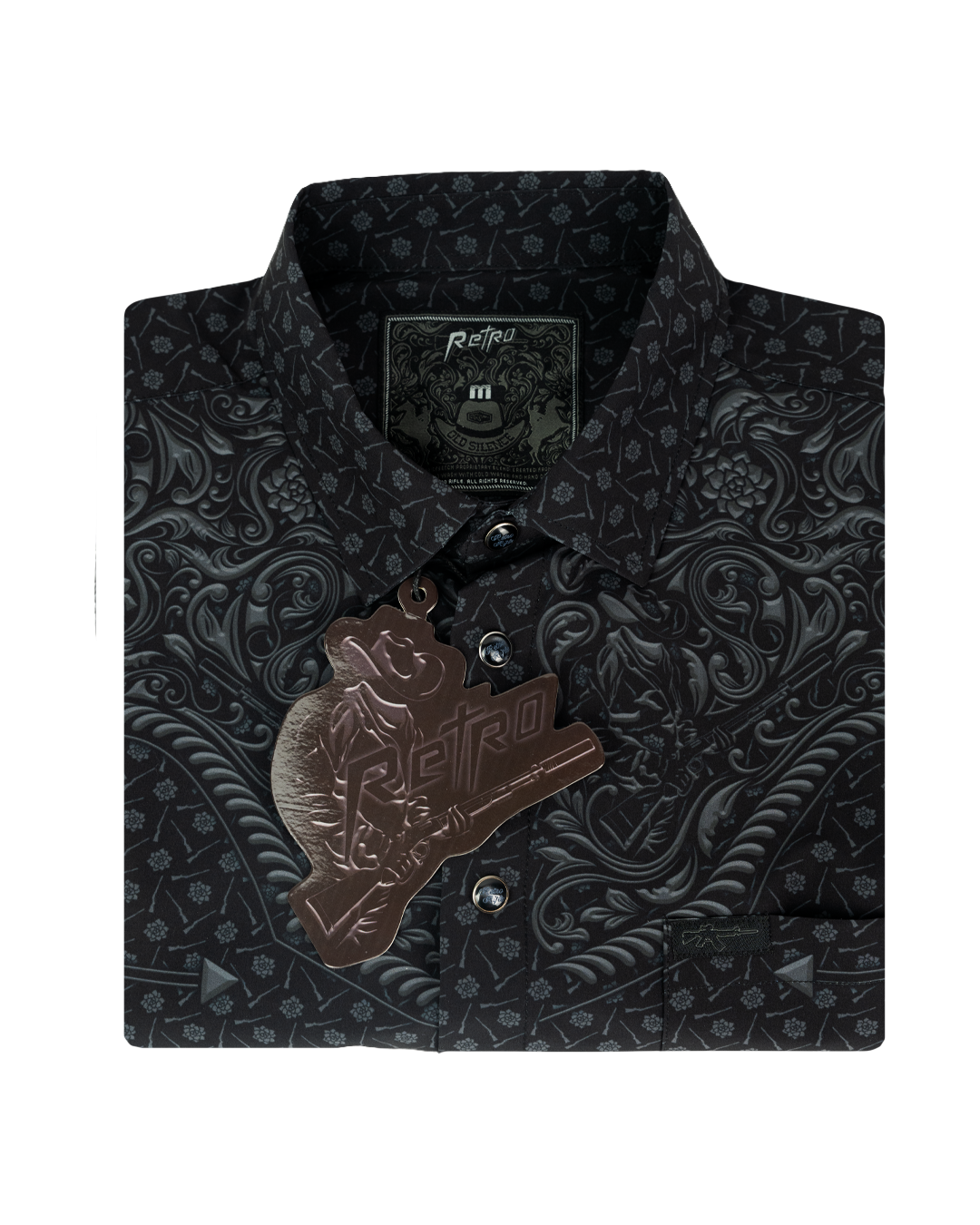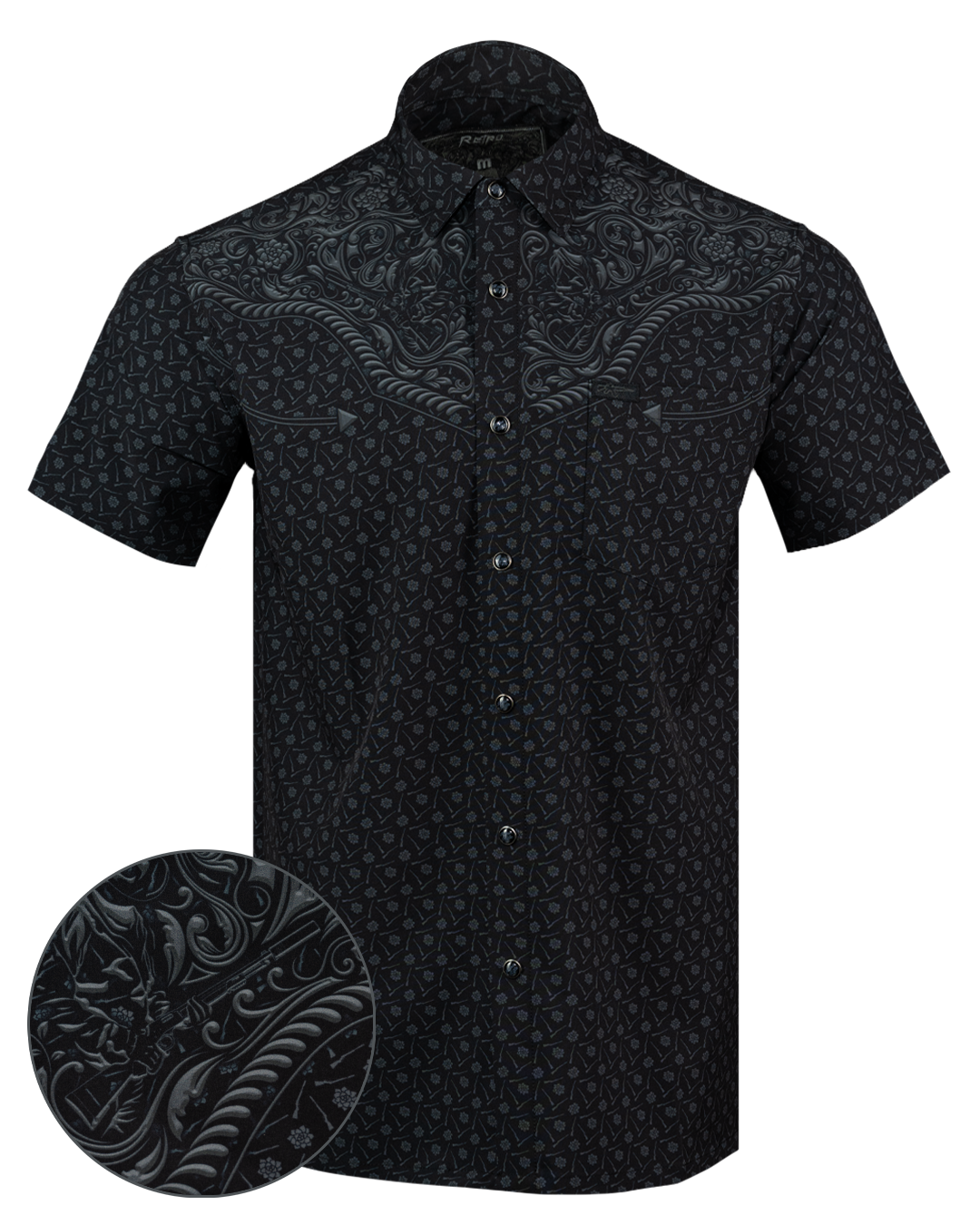 Not quite a high-noon duel, more light high-midnight. Light, breathable button down. 3000+ positive reviews. Custom black pearl snaps.